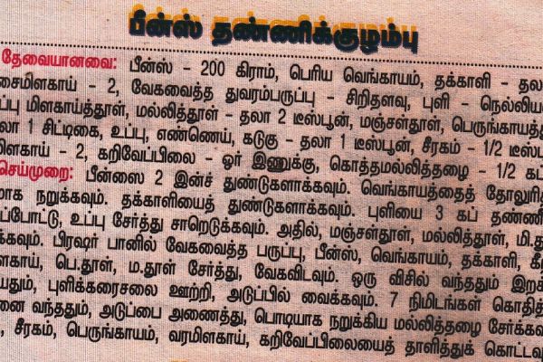 பீன்ஸ் தண்ணிக் குழம்புதேவையானவை:- பீன்ஸ் - 200 கி, பெரிய வெங்காயம் - 1, தக்காளி - 1பச்சை மி...