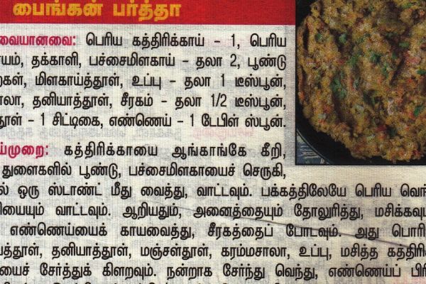 பைங்கன் பர்த்தாதேவையானவை:- பெரிய கத்திரிக்காய் – 1, பெரிய வெங்காயம் – 2, தக்காளி – 2, பூĩ...