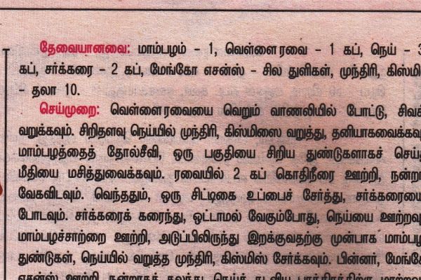 மாம்பழக் கேசரிதேவையானவை:- வெள்ளை ரவை – 1 கப், நெய் – முக்கால் கப், சர்க்கரை- 2 கப், மாம்ப...