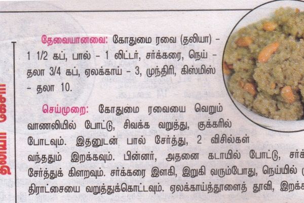 தலியா(கோதுமை ரவை) கேசரிதேவையான பொருட்கள்:- கோதுமை ரவை – 1 1/2 கப், பால் – 1 லி., சீனி – ¾ கப், நெ&...