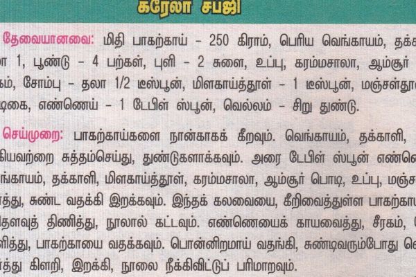 கரேலா சப்ஜிதேவையானவை :- மிதி பாகற்காய் - 250 கி, பெரிய வெங்காயம் - 1, தக்காளி 1, பூண்டு - 4, புளி - 2 ...