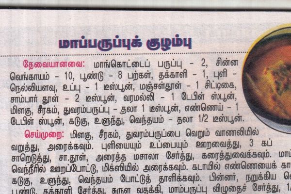 மாங்கொட்டைப் பருப்புக் குழம்புதேவையானவை:- மாங்கொட்டைப் பருப்பு – 2 (மாங்காய் கொட்...
