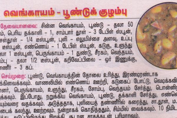 வெங்காயம் வெள்ளைப்பூண்டுக் குழம்புதேவையானவை:- சின்ன வெங்காயம் - 50 கி, வெள்ளைப்பூணĮ...