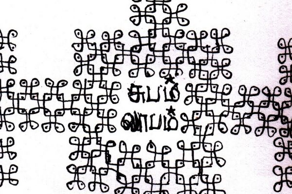 சுபம் லாபம் கோலம்நேர்ப்புள்ளி 28 - 4 வரிசை, 10 - 4 வரிசை, 4 - 4 வரிசை, 12 - 4 வரிசை.