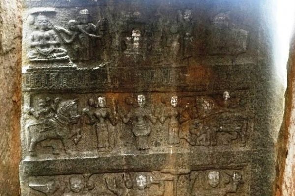 The sati stone is of three tiers. In the lower tier a war scene is shown. In that a lady is shown with her hand in raised position. The lady might have died due to hitting of two arrows and a sword or an arrow on her head. She may belongs to a royal fami