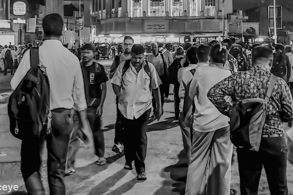 Crowded street outside Bandra West Railway station. On the right are people queuing up for a bus and in the background is a lit up mosque.Linking to Black and White Weekend ...