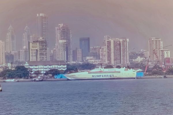 An M2M Ferry in the Mumbai harbour against the Mumbai skyline.Linking to Tom
