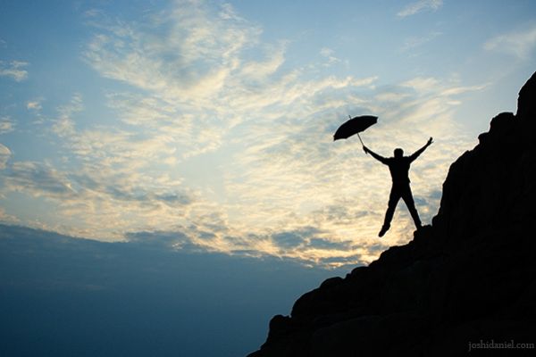Silhouette of a guy jumping with umbrella