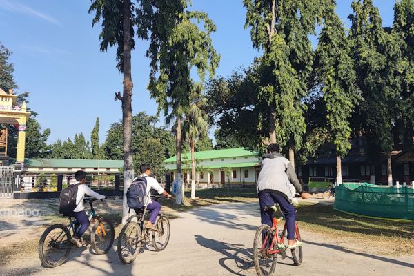 School boys riding on bicycle ...Photography at Abhayeswari H.S. and M.P. School campus Location: Abhayapuri, Bongaigaon, Assam, India