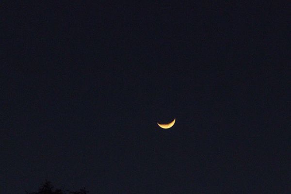 A golden crescent moon in a cloudless sky.Linking to  Skywatch Friday    ...
