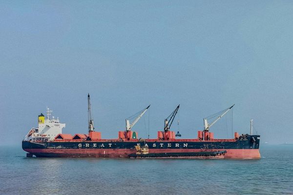 A bulk carrier anchored offshore in the Arabian sea off Mumbai harbour.
