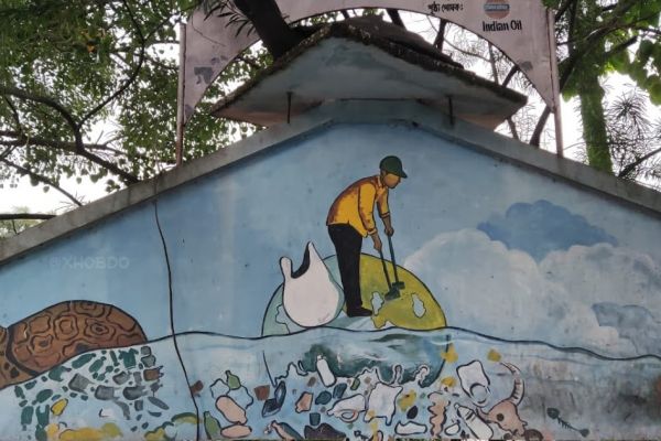 Wall mural on Conservation of Turtles in the historic Jorpukhuri (pond) Jorpukhuri is one of the oldest ponds of Guwahati and habitat to more than 10 rare species of turtles. Location : Sri Sri Ugratara Devalaya, Jorpukhuri, Uzan Bazaar, Guwahati, Assam,India