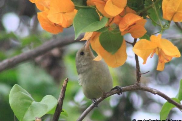 This is a 8 cm long tiny bird. The bird is plain brownish to olive green. The underside is buff olive. It has been considered one of the early flowerpeckers, originating in the Malay Peninsula, to colonize the Indian Subcontinent.