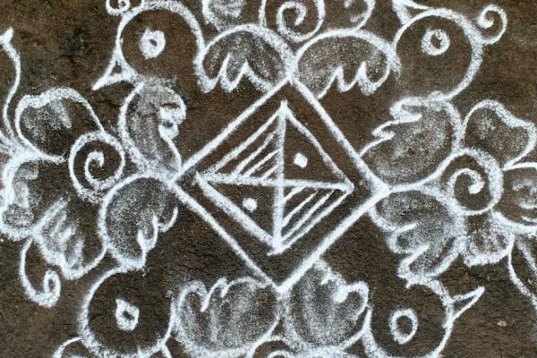 This is a beautiful *white chalk kolam (rangoli)* with a symmetrical floral design.- Elegant curved flower petals and swirls extending outward from the center, creating a lush, organic frame.- The entire design is drawn with white rice‑flour powder on a dark ground, giving it a crisp, traditional touch “Stunning white floral kolam with a diamond‑center motif, crafted by _Unique Creations kolangal_. Perfect for festive entrances or Pongal celebrations, this...