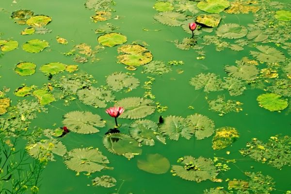 Red water lilies (Sapla flower) blooming on the lake. A common site in lakes of Bengal. It is the National flower of Bangladesh also.