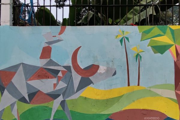 Beautiful street wall mural on a Farmer plays a Mohor Singor Pepa (A pipe made from buffalo's horn) sitting atop his buffalo.