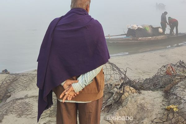 An old man watches the fishing boats return from the Brahmaputra river Location: Uzan Bazaar, Guwahati, Assam, India