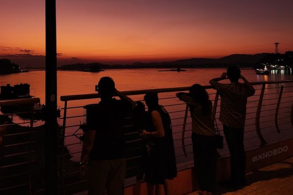 People enjoying view of mighty river Bramhaputra during sunset Location : Brahmaputra Riverfront, Uzaan Bazaar, Guwahati, Assam