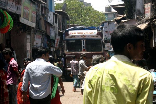 Big truck entering a small lane in Dharavi
