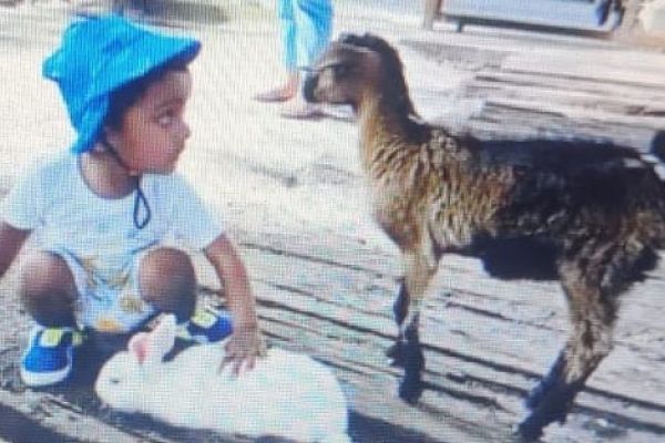 On a jolly day, on a holiday, with parents a toddler has fun...