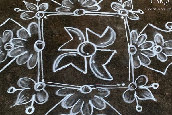 ..."Transform your doorstep with this elegant and simple white rangoli design! 🌸 A perfect blend of floral motifs and geometric symmetry. This traditional kolam is easy to recreate and adds a touch of grace to any home. #Rangoli #Muggulu #Kolam #IndianArt #DailyRangoli"
