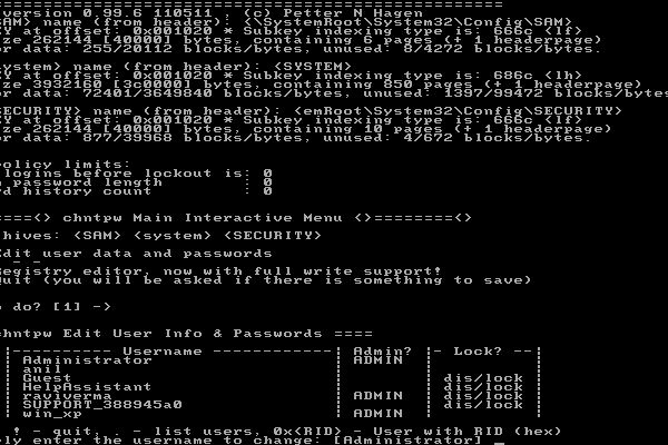 Hiren Boot CD is a collection of tools for Windows OS. One notable tool is used to clear forgotten Windows password. This tool has near 100% success rate.